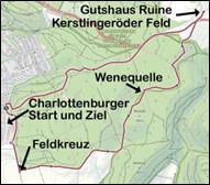 Danach führt uns der Weg mit einer schönen Aussicht Richtung Süden weiter am Waldrand. Bald ist der Wenegrund erreicht und es geht mal wieder bergauf durch den Wald, an der Wenequelle vorbei bis zum Kerstlingeröder Feld. Dort ist es nicht mehr weit bis zu unserem Ziel, der Ruine des ehemaligen Gutshauses. Die dortige Pause wird wieder für Erklärungen genutzt werden.