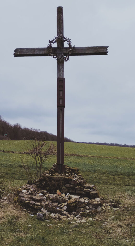 Zunächst geht es gemächlich bergauf über die Trift zum Waldrand. Aber dann wird es steil! Wir steigen hinab in den Helmsgrund, wo wir den Landwehrgraben überqueren, und kraxeln dann wieder hoch zum Feldkreuz. Von dort hat man einen guten Ausblick auf die Feldmark von Geismar. Hier wird es einige Erläuterungen und Informationen geben, denn in diesem Bereich ist mit einiger Sicherheit die Lage des ehemaligen Dorfes Herdingerode zu lokalisieren.